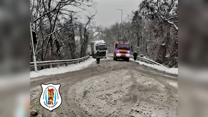 A jelzést az ilyenkor szokásos protokoll szerint továbbítottuk az illetékes katasztrófavédelmi igazgatóság műveletirányításának, ők egyesületünk önkénteseit riasztották a helyszínre. Tűzoltóink néhány percen belül el is indultak tűzoltóautónkkal. Jelzett helyen egy kamion kb. 6 tonnányi autóalkatrész rakománnyal a havas úton megcsúszott, az íves emelkedőn saját erejéből elindulni már nem tudott. A helyszínen körzeti megbízottunk volt, aki kollégáinkkal együtt először a Szabadság utat, majd a műszaki mentés néhány percére a 10-es út forgalmát is megállította. A műszaki mentést a tűzoltóautó és drótkötél segítségével elvégeztük, a körzeti megbízottal való gyors és hatékony együttműködésnek köszönhetően a mentés mindössze néhány percre állította meg az egyébként is belassult, de folyamatos járműforgalmat! Köszönjük a járművezetők türelmét! Anyagi kár, személyi sérülés az esettel összefüggésben nem történt és talán ez a legfontosabb! Tűzoltóink adatfelvételezést követően 13 óra 58 perckor bevonultak állomáshelyükre.