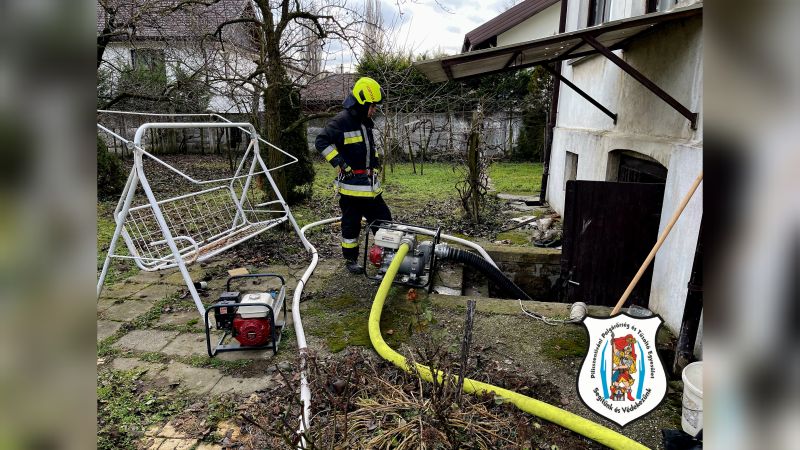 2026.02.07. Szombaton délután 13 óra 26 perckor kaptuk a riasztást a Fővárosi Katasztrófavédelmi Igazgatóság műveletirányításától, miszerint Pilisvörösváron a Fürdő utcában csőtörés történt, amitől a pincét elöntötte a víz.